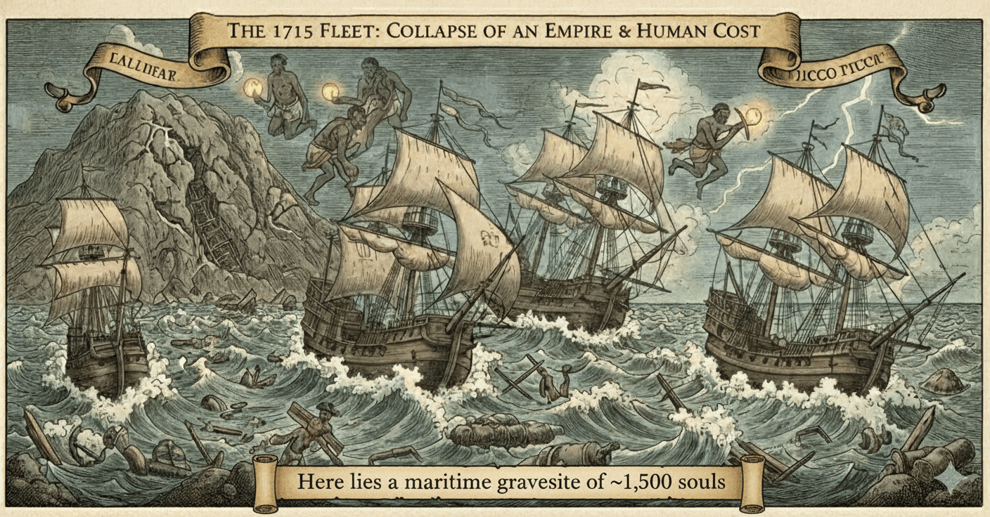 The 1715 fleet was Spain’s financial lifeline after the devastating War of Spanish Succession (1701-1714).27 King Philip V bet everything on this shipment to stabilize his throne and rebuild trade. Its loss triggered delayed debt payments, weakened naval power, and emboldened rivals.28 The Spanish Empire began its long decline—not from a single battle, but from six hours of wind and wave.